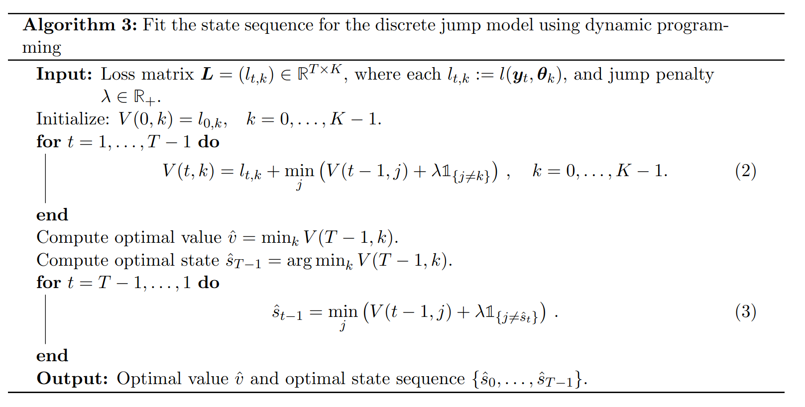 The second step involves a dynamic programming algorithm. Matrix memorizes the minimum cost of the first observations with the last state being . The first iteration finds the minimum cost, and the second iteration finds the optimal state sequence by working backward. This is very similar to a 0-1 knapsack problem to find maximum value and what items are selected. The algorithm is as follows: