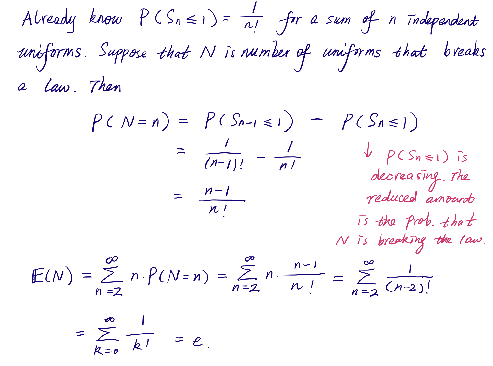 Prove by induction the more general result: If $0 \leq t \leq 1$, then $$ P\left(S_n \leq t\right)=\frac{t^n}{n !}, $$ where $S_n$ denotes the sum $X_1+\cdots+X_n$. The base case $n=1$ is clear. If holds for $n$, then calculate for $0 \leq t \leq 1$ : $$ P\left(S_{n+1} \leq t\right)=\int_0^1 P\left(S_n+x \leq t\right) f(x) d x \stackrel{(1)}{=} \int_0^t \frac{(t-x)^n}{n !} d x=\frac{t^{n+1}}{(n+1) !} $$